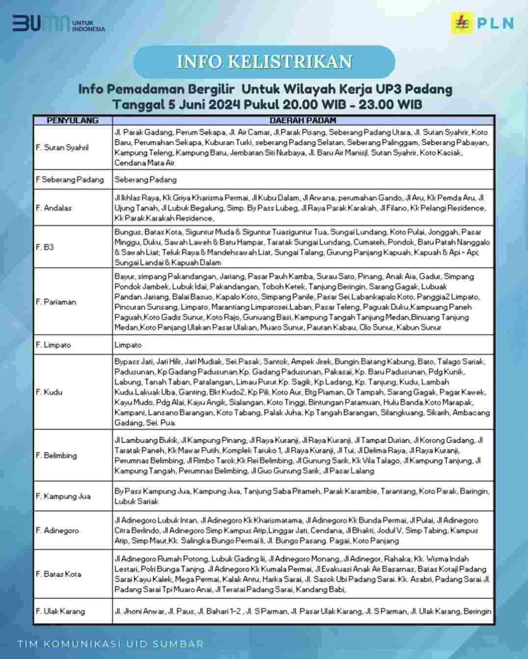 Jadwal pemadaman tersebut diunggah oleh akun PLN Sumbar di media sosial instagram, pukul 19.00 WIB.
