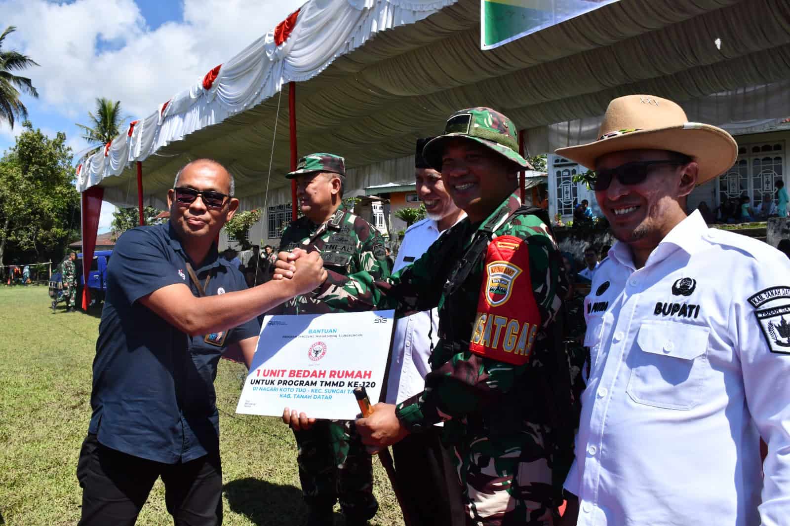 PADANG, HARIANHALUAN.ID-PT Semen Padang menyerahkan bantuan 1 unit bedah rumah Tidak Layak Huni (RTLH) dan 250 sak semen secara simbolis usai Upacara Pembukaan TNI Manunggal Membangun Desa (TMMD) ke-120 Tahun 2024 di Wilayah Kodim 0307/Tanah Datar di Lapangan Amphibi, Nagari Koto Tuo, Kecamatan Sungai Tarab, Kabupaten Tanah Datar, Rabu (8/5).