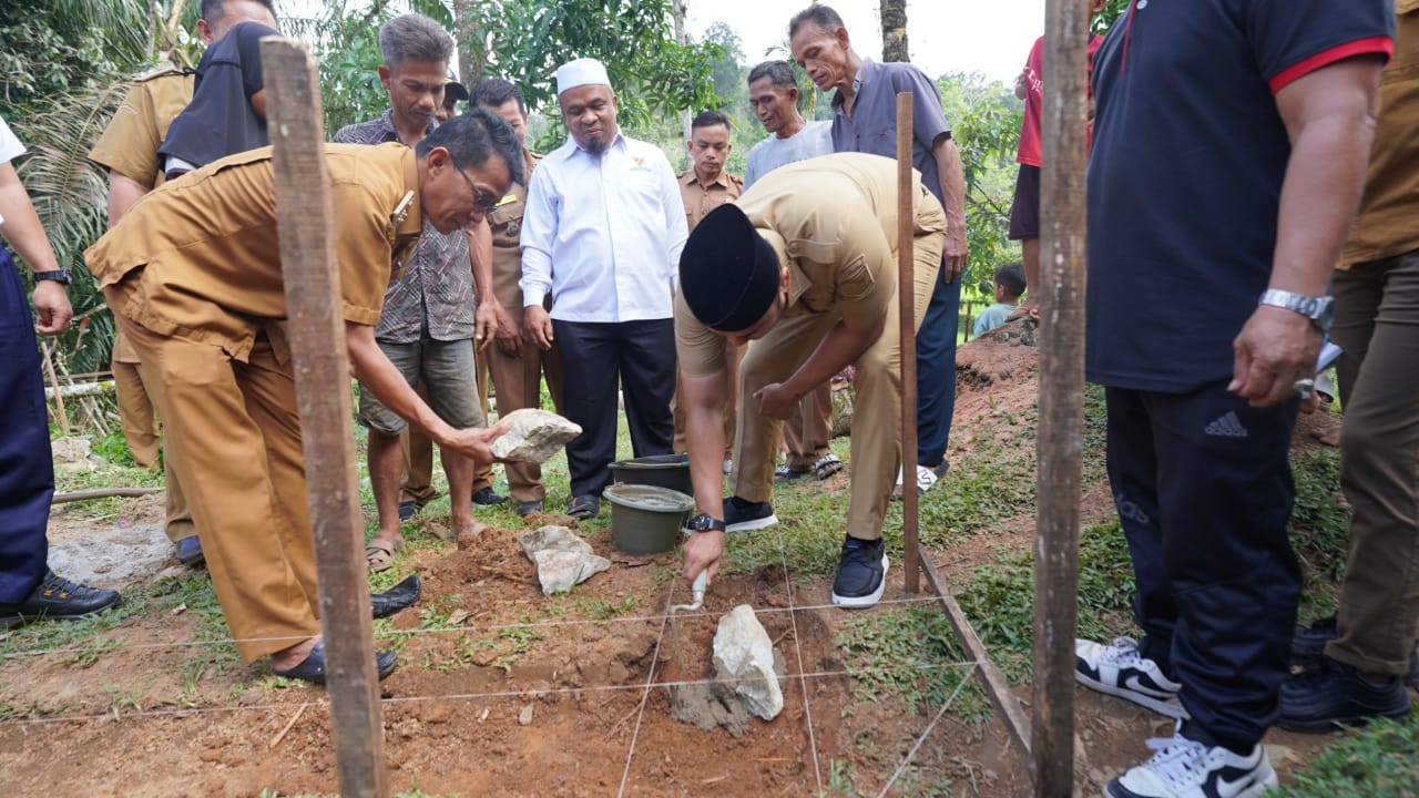 Keterangan Foto: Bupati Sijunjung Benny Dwifa Yuswir, S. STP, M. Si meletakkan batu pertama tanda akan dimulai nya pembangunan rumah layak huni (PRLH) program baznas Kabupaten Sijunjung bagi keluarga Susi Desmawati, Rabu (12/6) di Jorong Pasar Lamo Nagari Tanjung Lolo, Kecamatan Tanjung Gadang.