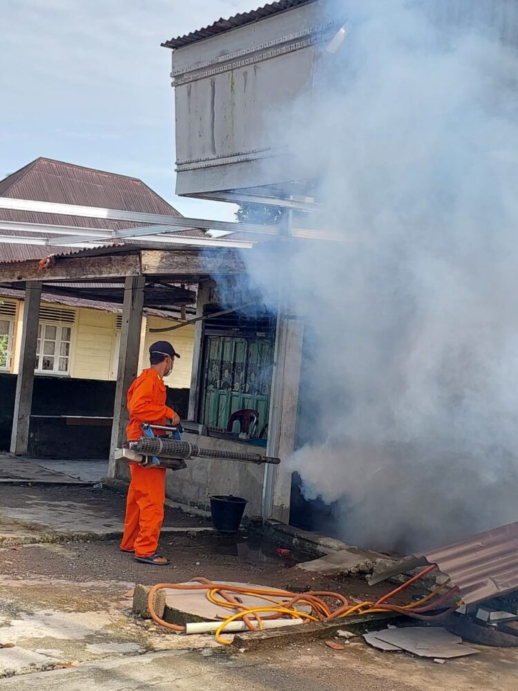 Teks foto : Seorang petugas melakukan fogging atau pengasapan untuk mengantisipasi nyamuk DBD. Osniwati