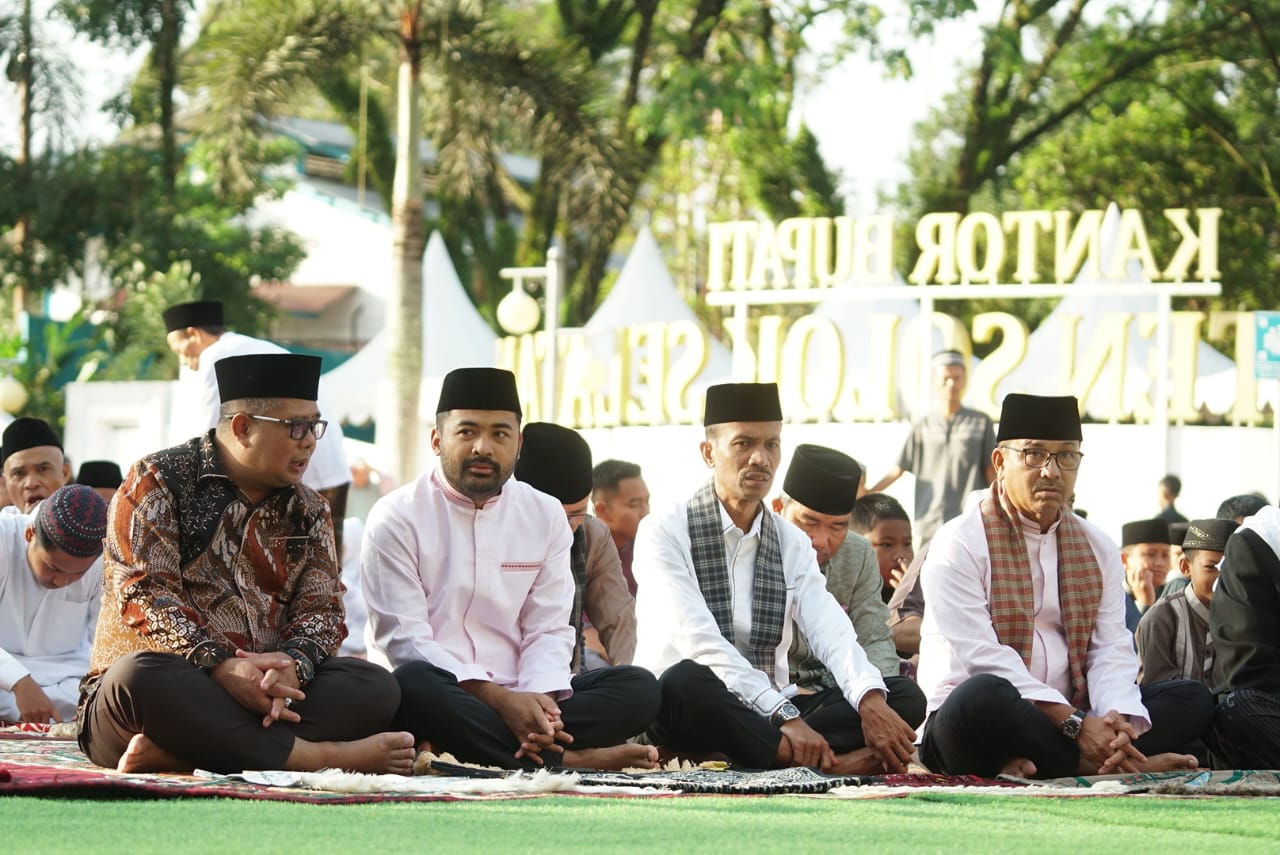 SOLOK SELATAN, HARIANHALUAN.ID – Jajaran Pemerintahan Kabupaten (Pemkab) Solok Selatan, Sumatera Barat, bersama unsur Forkopimda, OPD, tokoh masyarakat dan seluruh warga sekitar, melaksanakan perayaan Iduladha 1445 H/2024 M di Halaman Kantor Bupati Solok Selatan, Sangir, Senin (17/6/2024).