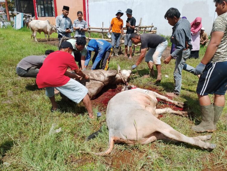 Ket foto : Dinas Pertanian dan Pangan Kota Bukittinggi mencatat, total hewan kurban di Bukittinggi hinga hari kedua idul adha 1445 H sebanyak 1.093 ekor hewan kurban. Gatot BUKITTINGGI, HARIANHALUAN.ID -- Jumlah hewan kurban di Kota Bukittinggi pada hari raya Idul Adha 1445 H tercatat sebanyak 1.093 ekor hewan kurban. Dengan rincian 994 ekor sapi dan 99 ekor kambing. Kepala Dinas Pertanian dan Pangan Kota Bukittinggi Hendry mengatakan, jumlah hewan kurban itu berdasarkan rekap hewan kurban pada tiga kecamatan yang ada di Kota Bukittinggi. Dengan rincian untuk Kecamatan Mandiangin Koto Selayan (MKS) tercatat sebanyak 452 hewan kurban yang terdiri dari 428 ekor Sapi dan 24 ekor Kambing. Kecamatan Guguk Panjang sebanyak 345 hewan kurban yang terdiri dari 325 Sapi dan 20 Kambing. Kecamatan Aur Birugo Tigo Baleh (ABTB) sebanyak 296 hewan kurbana yang terdiri dari 241 Sapi dan 55 ekor Kambing. "Total keseluruhan hewan kurban itu berdasarkan apdate yang kita lakukan hingga hari kedua pemotongan hewan kurban di Bukittinggi," kata Hendri, Selasa (18/6). Dikatakannya, sejumlah masjid dan mushala di Bukittinggi ada yang melakukan proses pemotongan hewan kurban setelah pelaksanaan sholat idul adha, Senin (17/6). Kemudian sebagian lagi ada yang melakukan pemotongan di hari kedua idul adha, Selasa (18/6). Menurut Hendri, satu hari menjelang hari raya idul adha 1445 H, tim pengawasan dan pemeriksaan hewan kurban Dinas Pertanian dan Pangan Kota Bukittinggi secara maraton melaksanakan tugas dilapangan untuk melakukan pengecekan kesehatan hewan kurban. Selain di mesjid dan mushalla, pengecekan kesehatan hewan kurban juga dilakukan pada sejumlah titik lokasi perkumpulan dan organisasi yang telah ditetapkan, serta di lokasi penampungan toke ternak. Hal tersebut dilakukan guna memastikan kondisi kesehatan hewan kurban itu sehat dan terhindar dari penyakit sebelum disembelih, serta daging hewan kurban yang dihasilkan layak dan aman untuk di konsumsi. "Guna memaksimalkan pelaksanaan pemotongan hewan kurban tersebut, sebelumnya Dinas Pertanian dan Pangan Bukittinggi juga telah memberikan sosialisasi tentang penatalaksanaan pemotongan hewan kurban yang Aman, Sehat, Utuh dan Halal (ASUH)," ujarnya. Ia menjelaskan, hewan kurban di Bukittinggi kebanyakan didatangkan dari daerah tetangga, seperti Kabupaten Agam, Limapuluh Kota, Payakumbuh, Tanah Datar, dan Solok. Hal ini karena Bukitinggi memang tidak punya kawasan peternakan yang luas, sehingga peternakan yang ada di Bukittinggi masih dikelola secara kecil kecilan. Disamping itu lahan untuk pengembangan hewan ternak juga sangat terbatas sekali. Dengan kondisi tersebut, populasi hewan ternak seperti seperti sapi, kerbau, dan kambing dari para peternak Bukitinggi sangat sedikit sekali. Namun demikian, ketersediaan hewan kurban untuk Bukittinggi masih bisa tercukupi setiap tahunnya. "Kita memperkirakan total hewan kurban yang dipotong pada idul adha tahun ini meningkat dibanding tahun sebelumnya," tutur Hendri (*)