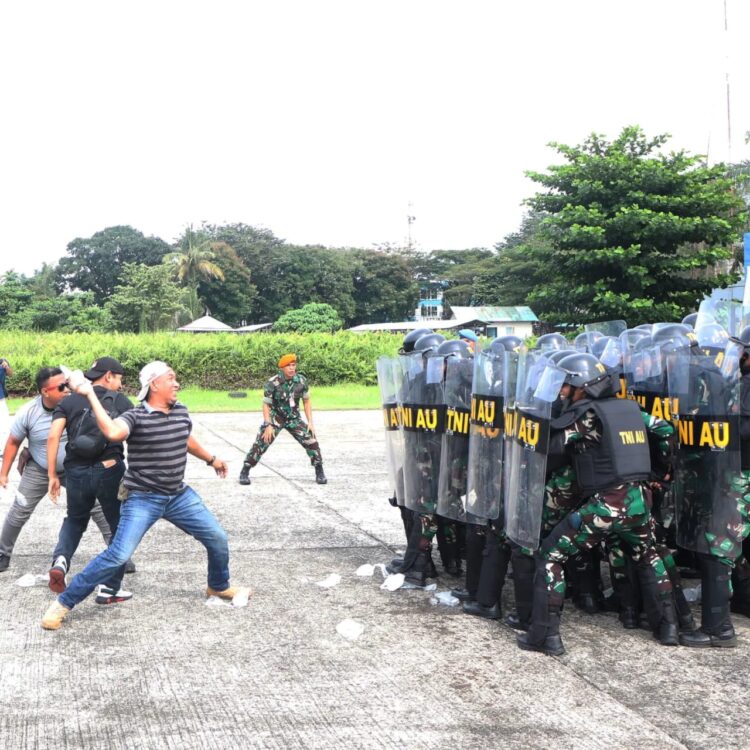 PADANG, HARIANHALUAN.ID – Personel Lanud Sutan Sjahrir melaksanakan kegiatan latihan Penanggulangan Huru Hara (PHH) yang digelar di Apron Dinas Operasi (Disops) Lanud Sut, Padang, Kamis (20/6). Hal tersebut dilaksanakan demi meningkatkan kemampuan dan profesionalisme dalam penanggulangan gangguan keamanan.