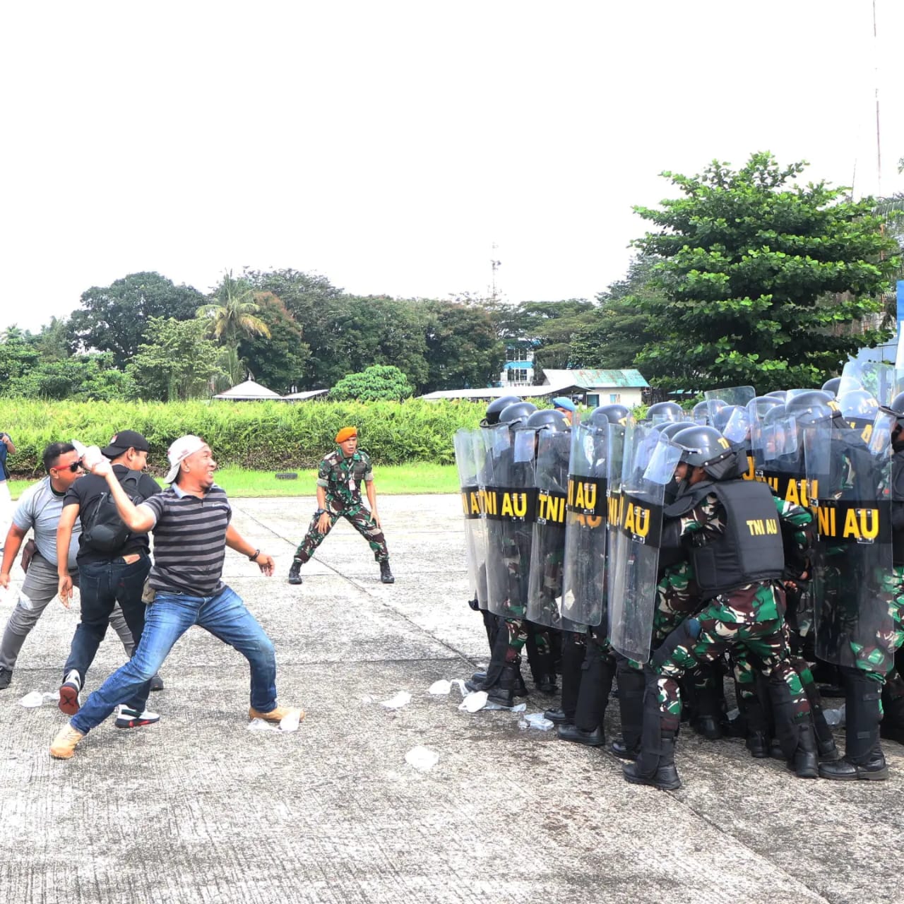 Dalam skenario latihan, dibuat kerusuhan yang terjadi antara Pendemo yang mengakuisisi tanah milik TNI AU. Para pendemo tersebut berjalan kaki dari Tempat tinggalnya menuju Lanud SUT dengan melakukan tindakan anarkis. Kemudian massa melakukan aksi brutal melempari petugas dengan batu dan air sehingga situasi tidak terkendali, dan pada akhirnya ada 1 provokator ditangkap Pihak Satpom Lanud SUT untuk ditindaklanjuti. (*)