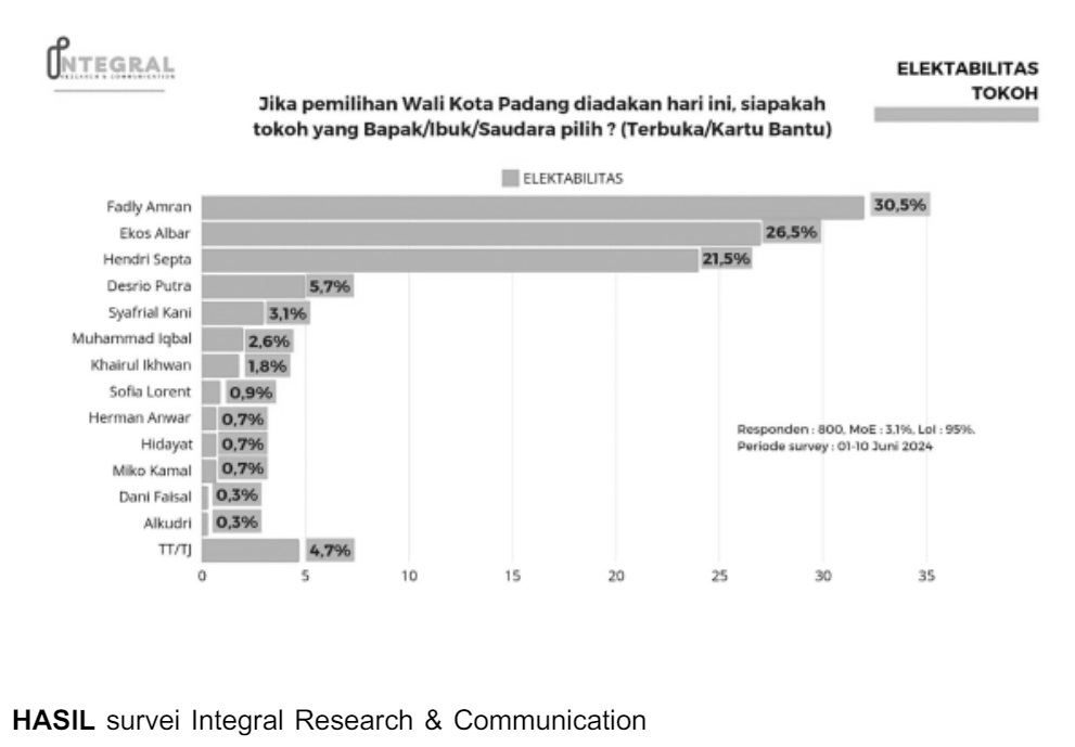 Analis Integral Research & Communication, M. Riswan mengatakan bahwa balon Wali Kota Padang yakni Fadly Amran, Ekos Albar dan Hendri Septa bersaing ketat, sebab elektabilitas mereka dapat disebut imbang.
