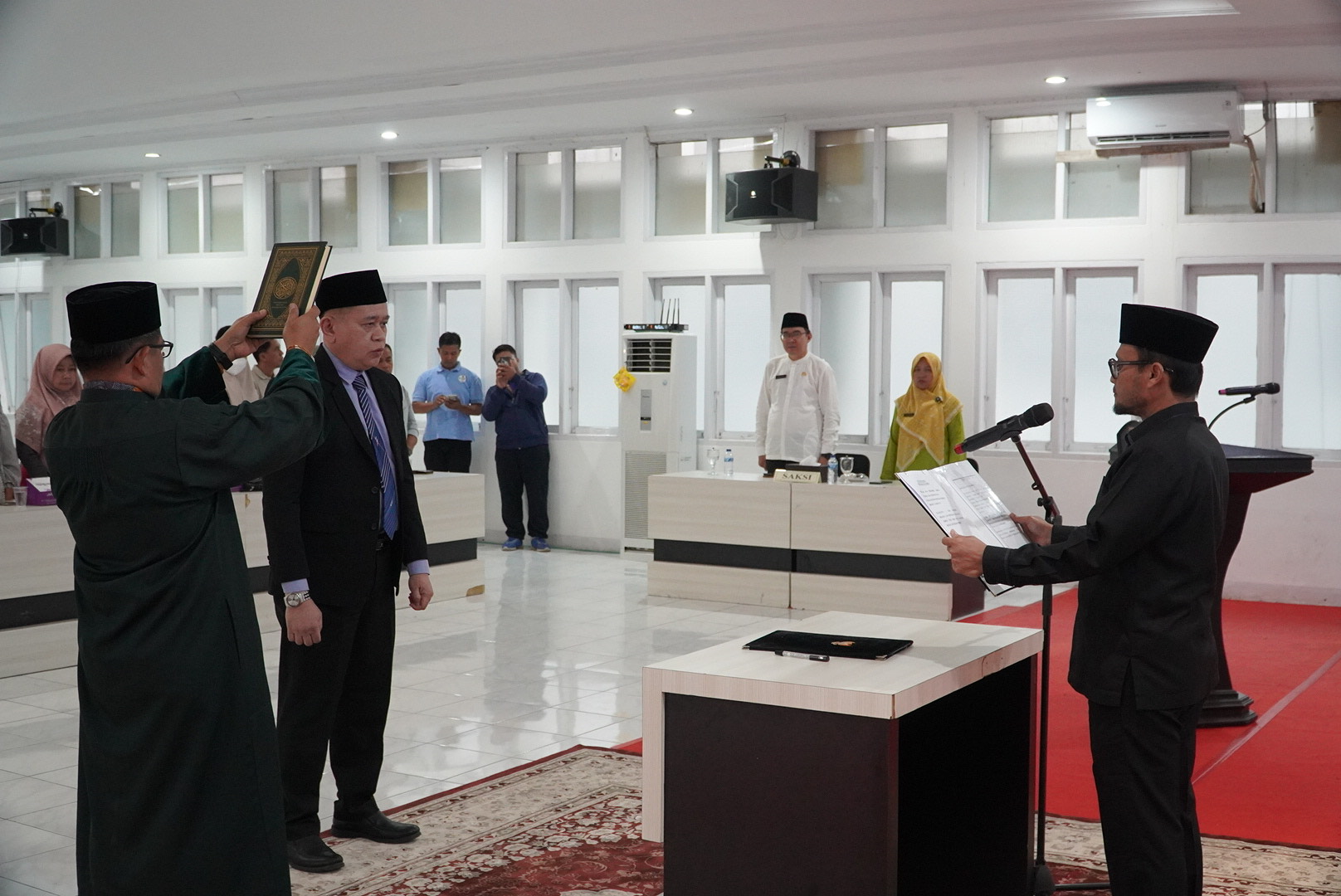 Teks Foto : dr. Joni Sastra saat diambil sumpahnya oleh Plh. Wali Kota Dr. Winarno di Aula Balaikota, Jumat (28/6). APIZRAJOALAM