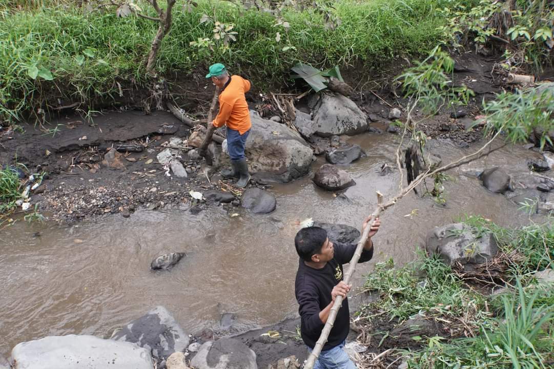 Terlihat ASN, THL, TNI, Polri serta warga setempat bahu membahu membersihkan sisa material lahar dingin di tujuh titik sepanjang 920 meter sungai yang melintasi kelurahan ini.