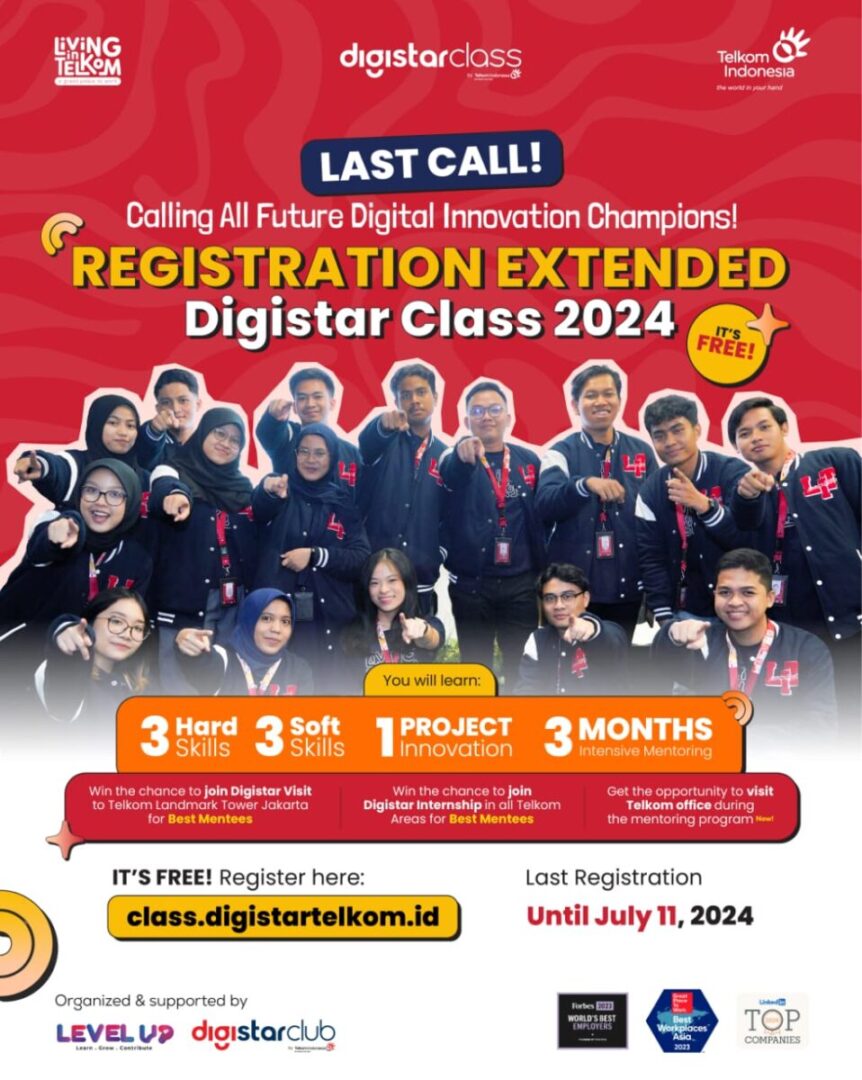 VP HC Culture & Industrial Relations Telkom, Iwan Setiawan menyampaikan bahwa pendaftaran Digistar Class secara resmi dibuka sejak 24 Juni lalu. “Digistar Class telah dirancang dengan komprehensif agar bisa memberi journey terbaik bagi para mentees. Antusiasme yang tinggi setiap tahunnya pada program ini memberi semangat bagi kami untuk mengadakannya dengan semaksimal mungkin.” Ia juga turut mengajak generasi muda untuk tidak melewatkan kesempatan emas ini dengan beragam manfaat yang tersedia.