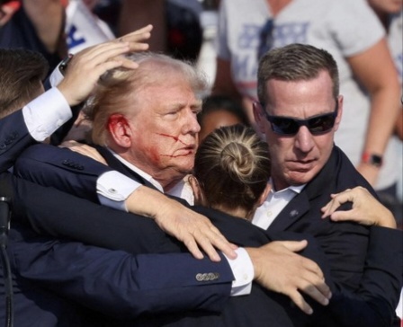 Kandidat Presiden dari Partai Republik itu terlihat berdarah di telinga kanannya saat ia dikelilingi oleh petugas keamanan, yang menggiringnya turun dari panggung.
