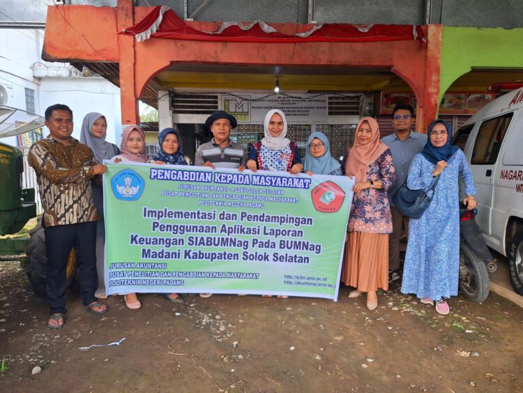 HARIANHALUAN. ID – Dosen Jurusan Akuntansi Politeknik Negeri Padang (PNP) melaksanakan kegiatan pengabdian kepada masyarakat (PKM) di Badan Usaha Milik Nagari (BUMNag) Madani Nagari Lubuak Malako Kabupaten Solok Selatan. Kegiatan PKM ini dilakukan dalam bentuk implementasi penggunaan Aplikasi Laporan Keuangan Sistem Informasi Akuntansi BUMNag. Pelatihan diberikan Tim Pengabdian PNP kepada staf atau SDM BUMNag Madani Nagari Lubuk Malako agar dapat memberikan pemahaman yang lebih terhadap pengelolaan keuangan BUMNag Madani Nagari Lubuk Malako.