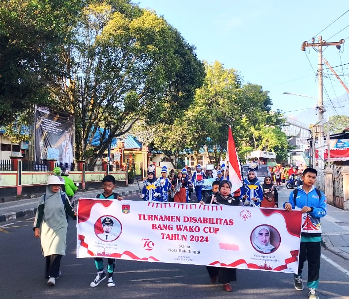 BUKITTINGGI, HARIANHALUAN.ID– Ratusan siswa disabilitas dari Sekolah Luar Biasa (SLB) se Kota Bukittinggi mengikuti pawai kegiatan Turnamen Disabilitas Bang Wako Cup Tahun 2024, Sabtu (20/7/2024)