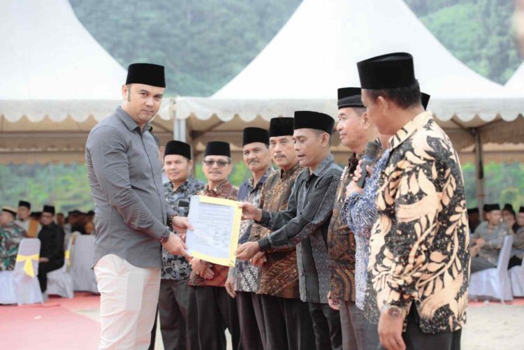SIJUNJUNG, HARIANHALUAN.ID- Bupati Sijunjung Benny Dwifa Yuswir S.STP, M.Si melakukan peletakan batu pertama (groundbreaking) pembangunan Masjid Agung Baitussalam Nagari Muaro Takung, Kecamatan Kamang Baru, Sabtu (20/7/2024).