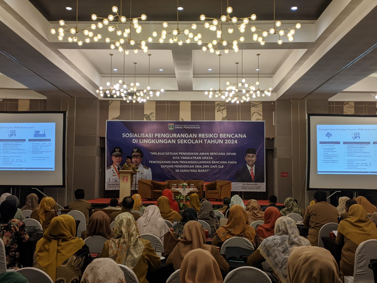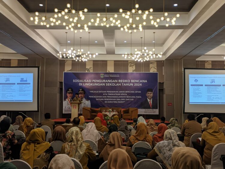 PADANG, HARIANHALUAN.ID – Pemerintah Provinsi (Pemprov) Sumatera Barat (Sumbar) melalui Dinas Pendidikan Sumbar menggelar sosialisasi pengurangan resiko bencana di lingkungan sekolah. Sosialisasi dengan tema Satuan Pendidikan Aman Bencana (SPAB) tersebut merupakan upaya pencegahan dan penanggulangan bencana pada satuan pendidikan.