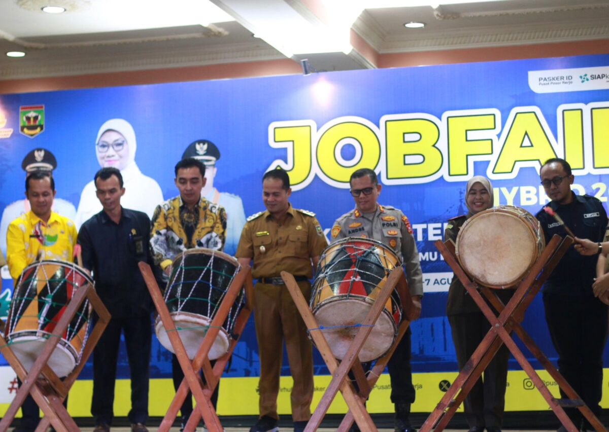 Keterangan Foto: Wakil Bupati Sijunjung H.Iraddatillah S.Pt didampingi Muspida, Kepala OPD terkait serta perwakilan beberapa perusahaan saat membuka secara resmi Jobfair Hybrid, Selasa (6/8) di GOR Sibinuang Sati Muaro Sijunjung.