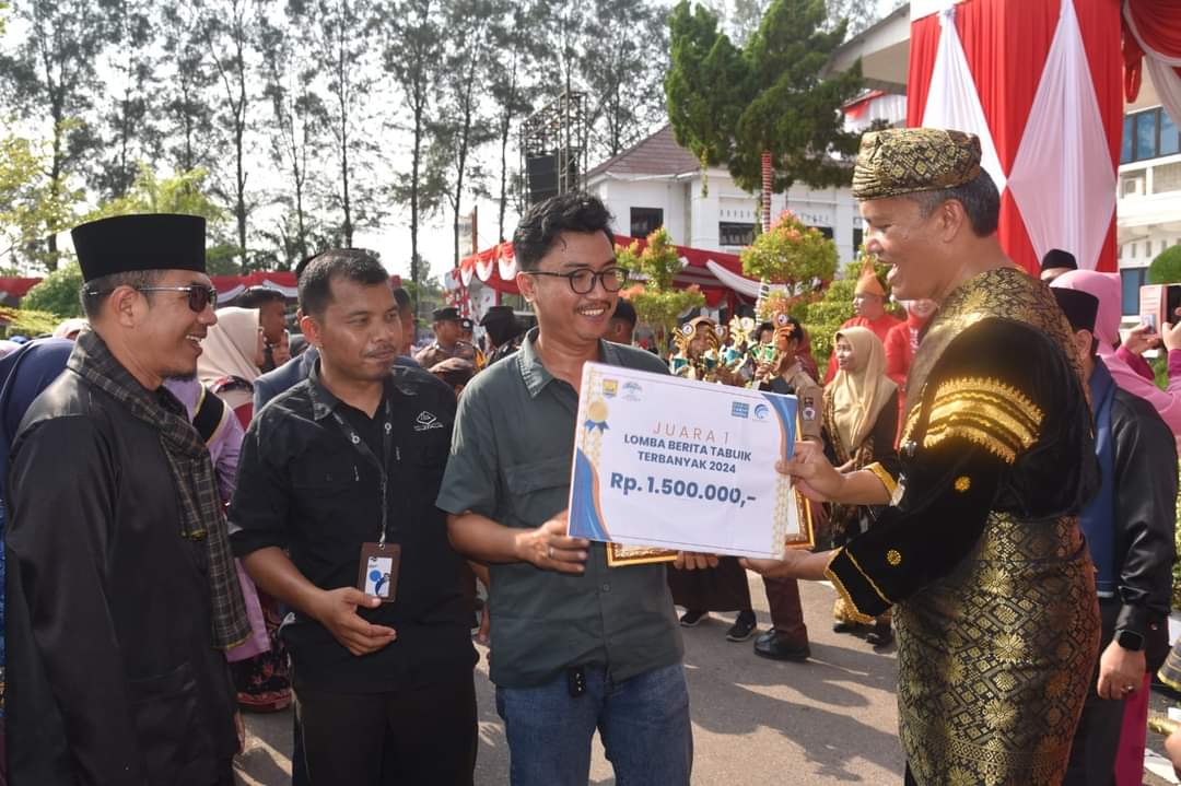 Penjabat (Pj) Wali Kota Pariaman Roberia yang menyerahkan piagam penghargaan secara langsung kepada lima orang pemenang yang terdiri dari insan pers yang telah menjalin kerja sama dengan pemerintah kota pariaman. Hadiah diserahkan usai upacara bendera memperingati Hari Ulang Tahun (HUT) Republik Indonesia (RI) ke-79, di halaman balaikota Pariaman.