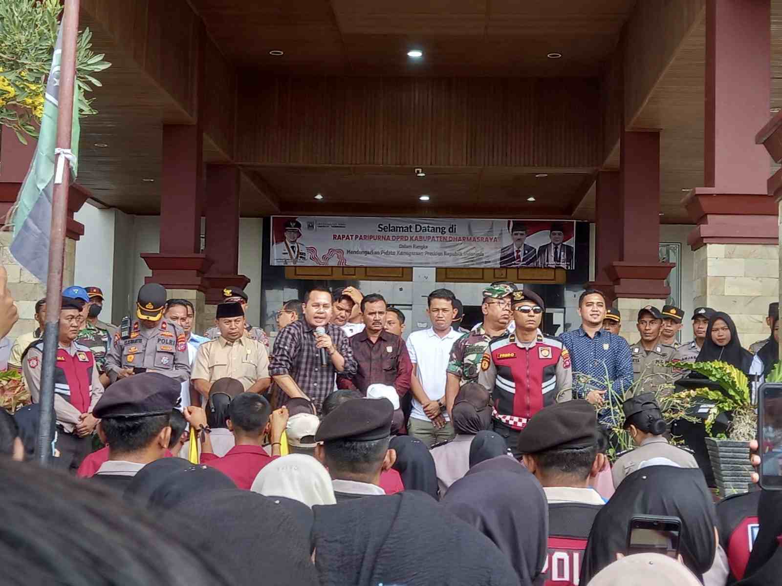 Di halaman kantor DPRD setempat, ratusan mahasiswa terus berorasi, bahwa DPRD adalah wakil rakyat yang harus berpihak pada rakyat. Sementara, ketua Koordinator Umum, Ego Jomendra dalam orasinya meminta agar anggota DPRD Dharmasraya untuk dapat mengawal tujuh tuntutan.