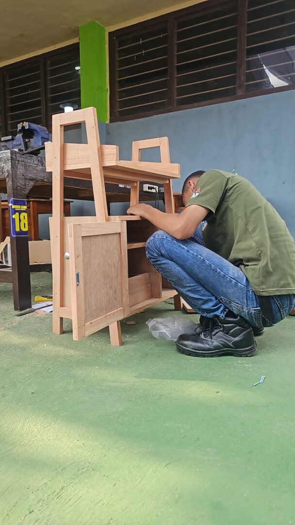 Teks Foto : Rivaldo Ilham siswa SMKN 1 Bukittinggi sedang membuat Cabinet Making pada lomba LKS di Universitas Lampung.