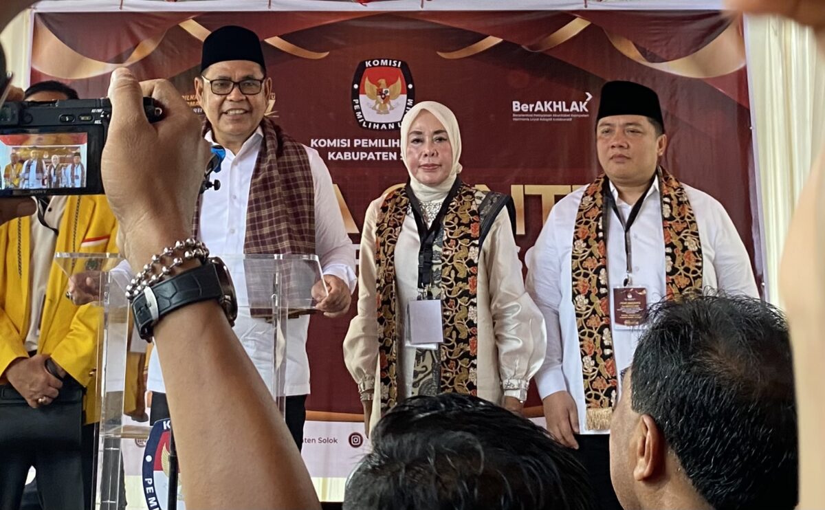 SOLOK, harianhaluan.id—Pasangan calon (Paslon) Bupati dan Wakil Bupati Solok Emiko dan Irwan Afriadi mendaftar ke kantor Komisi Pemilihan Umum (KPU) Kabupaten Solok di Nagari Koto Baru, Kecamatan Kubung pada Rabu (28/8/2024).