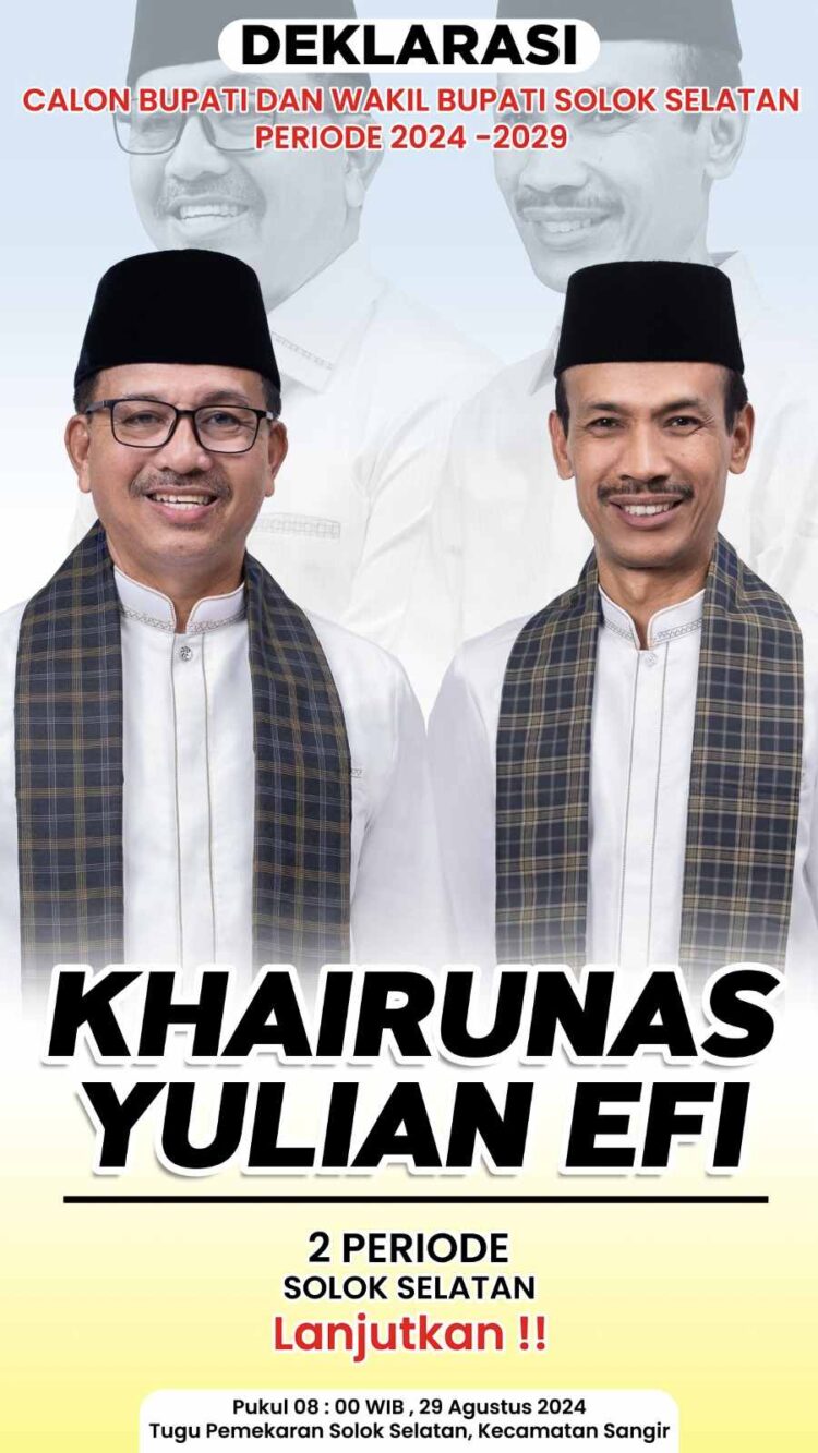 SOLOK SELATAN, HARIANHALUAN.ID- Pasangan Calon Bupati dan Wakil Bupati Solok Selatan Khairunas dan Yulian Efi diagendakan akan mendaftar ke KPU Solok Selatan sebagai kontestan Calon Bupati dan Wakil Bupati Solok Selatan di Pilkada tahun ini.
