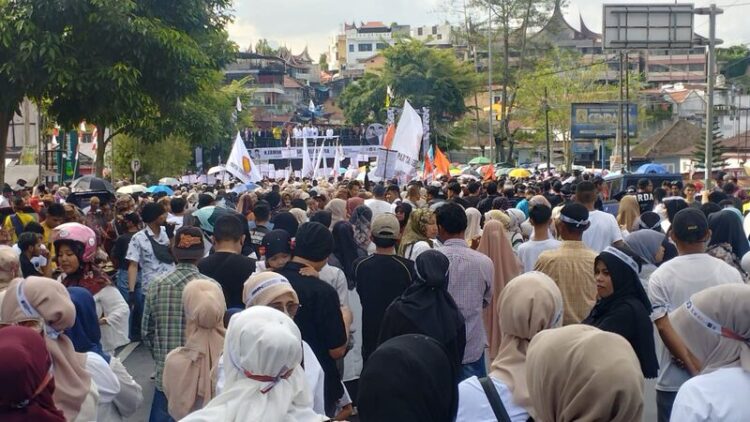 BUKITTINGGI, HARIANHALUAN.ID – Meski sempat diguyur hujan, tak menyurutkan semangat ribuan orang menghadiri deklarasi pasangan calon wali kota dan wakil wali kota Erman Safar-Heldo Aura yang dipusatkan di Jalan Perintis Kemerdekaan Kota Bukittinggi, Kamis(29/8) siang.