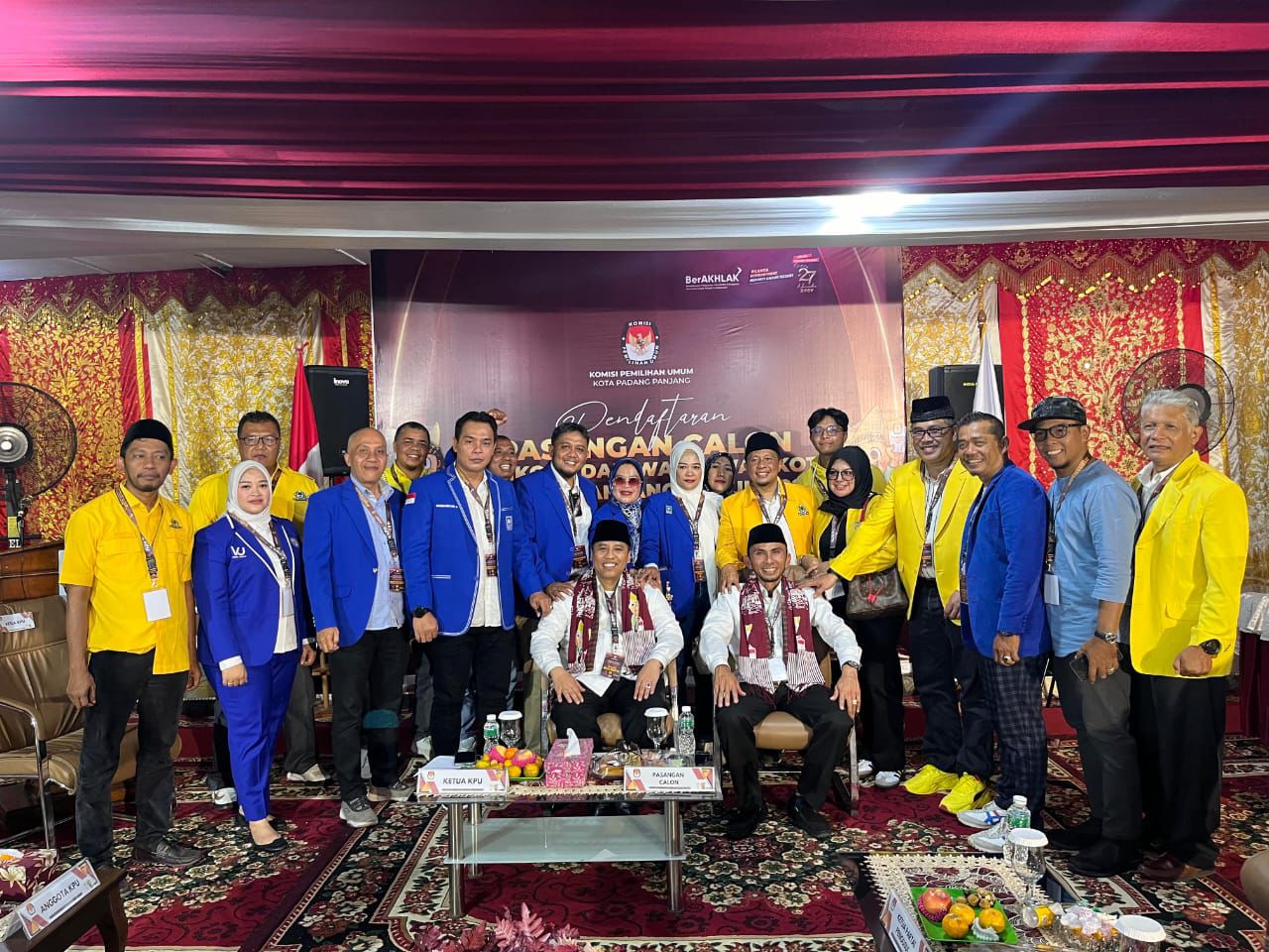 PADANG PANJANG, HARIANHALUAN.ID —Pasangan Hendri Arnis-Allex Saputra yang diusung koalisi Partai Golkar dan Partai Amanat Nasional (PAN), mendaftar ke KPU Kota Padang Panjang, Kamis (29/8/2024).