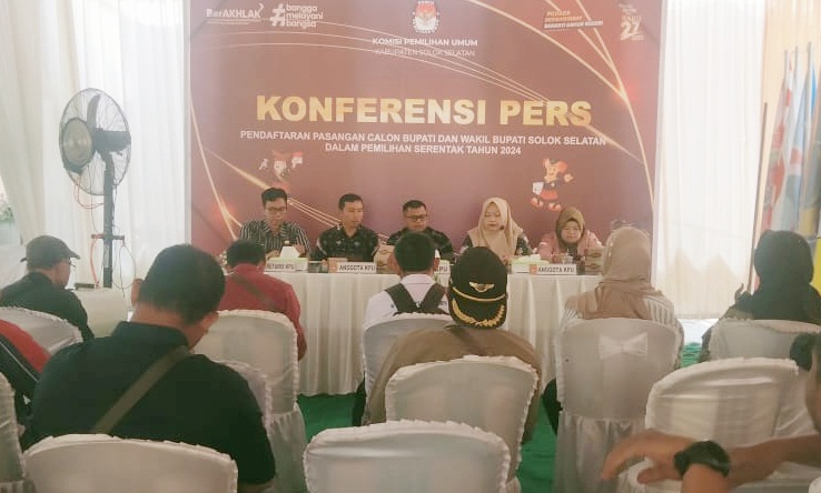 SOLOK SELATAN, HARIANHALUAN.ID – Komisi Pemilihan Umum (KPU) Kabupaten Solok Selatan, menggelar konferensi pers untuk menyampaikan hasil rekapitulasi pendaftaran Pasangan Calon (Paslon) Bupati dan Wakil Bupati Solok Selatan untuk Pilkada 2024, yang telah berlangsung tiga hari sejak tanggal 27 hingga 29 Agustus 2024.