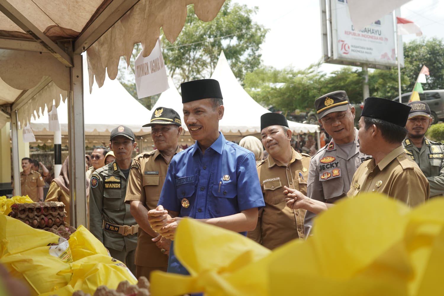 SOLOK SELATAN, HARIANHALUAN.ID- Wakil Bupati Solok Selatan Yulian Efi menerjunkan bantuan pangan cadangan beras pemerintah (BP-CBP) oleh Bapanas yang berkolaborasi dengan PT. POS dan Bulog, di halaman Kantor Camat Sangir Balai Janggo, Selasa (3/9).