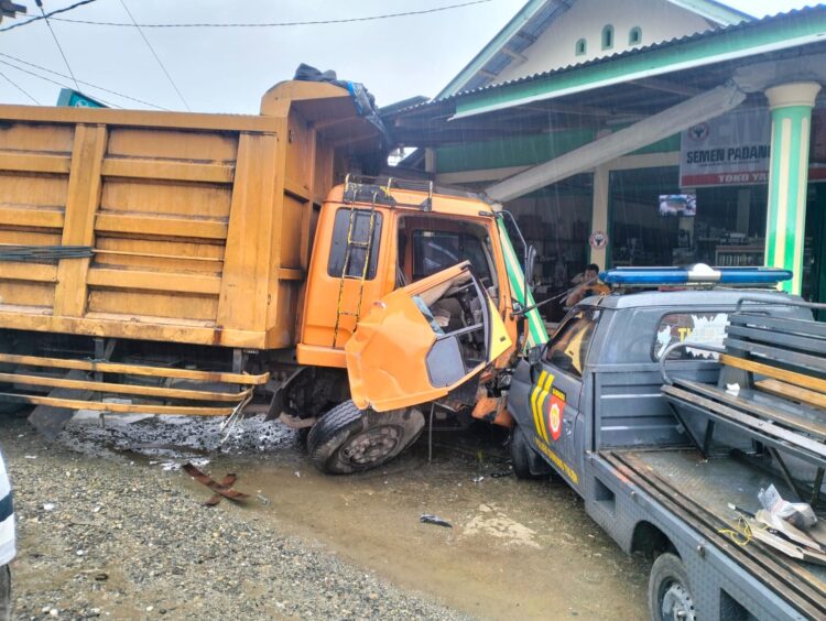 PASAMAN BARAT, HARIANHALUAN.ID- Diduga hilang kendali, fuso tronton dump truck tabrak mobil Patroli Polsek Gunung Tuleh di Jalan Lintas Jorong Kampung Alang Nagari Muaro Kiawai, Kecamatan Gunung Tuleh, Kabupaten Pasaman Barat Pasbar Senin, (9/9/2024).