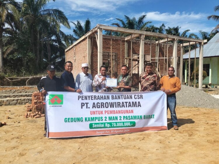 SUNGAI AUR, HARIANHALUAN.ID- PT Agrowiratama kembali menunjukkan komitmennya dalam mendukung pendidikan di Pasaman Barat dengan menyerahkan bantuan dana Corporate Social Responsibility (CSR) sebesar Rp 70.000.000, kepada Kampus 2 MAN 2 Pasaman Barat, Jumat, (30/8/2024).