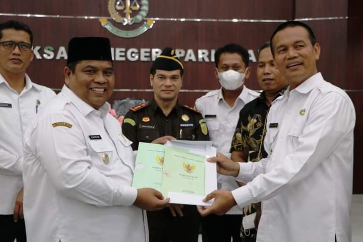 Serah terima aset langsung dilaksanakan Bupati Padang Pariaman Suhatri Bur bersama Walikota Pariaman, Genius Umar yang dilaksanakan di Aula Kejari Pariaman, Rabu (25/05/22) siang. Serah terima aset disaksikan Kajari Pariaman dan Forkopimda serta OPD kedua daerah tersebut.