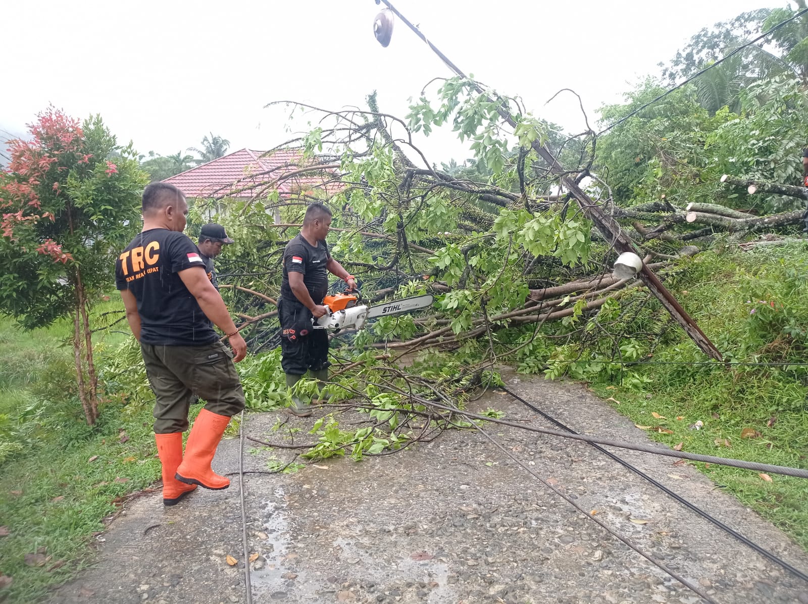 4. Dua titik pohon tumbang di Kampung Tanjung, Gunung Sarik, salah satunya menimpa rumah warga.
