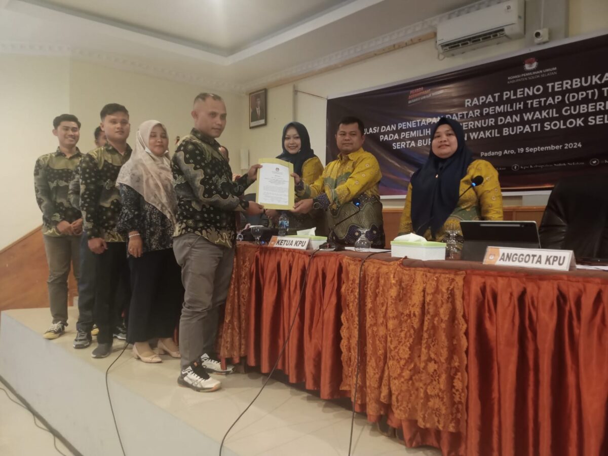 SOLOK SELATAN, HARIANHALUAN.ID – Komisi Pemilihan Umum (KPU) Kabupaten Solok Selatan telah menetapkan Daftar Pemilih Tetap (DPT) untuk Pemilihan Kepala Daerah (Pilkada) Gubernur dan Wakil Gubernur Sumatera Barat serta Bupati dan Wakil Bupati Solok Selatan 2024.