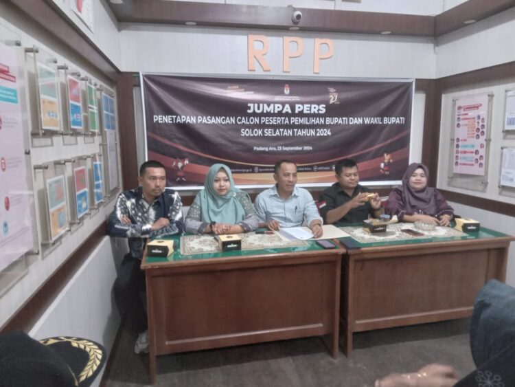 Hal ini di sampaikan dalam konferensi pers di ruang RPP KPU Solok Selatan, senin (23/9). Keputusan penetapan tersebut didasarkan pada berita acara KPU Solok Selatan Nomor 217 tahun 2024 dalam rapat pleno tertutup yang digelar pada Minggu (22/9).
