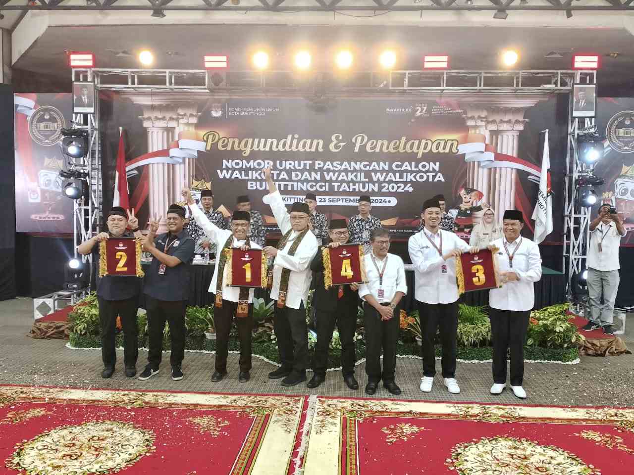 BUKITTINGGI, HARIAN.HALUAN.ID- Komisi Pemilihan Umum (KPU) Kota Bukittinggi menetapkan nomor urut pasangan calon Wali Kota dan Wakil Wali Kota Bukittinggi di Balai Sidang Bung Hatta Bukittinggi, Senin (23/9/2024).
