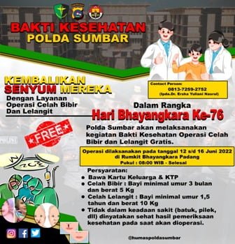 HALUANNEWS, PADANG – Menyambut Hari Bhayangkara ke-76, Kepolisian Daerah Sumatra Barat (Polda Sumbar) menggelar bakti kesehatan dalam bentuk operasi celah bibir dan langit-langit.