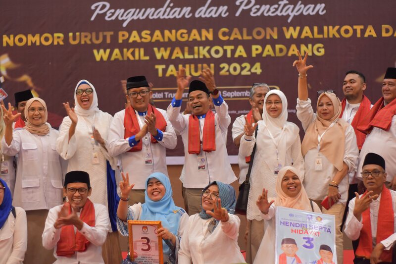 PADANG, HARIANHALUAN.ID – Pasangan Calon Wali Kota dan Wakil Wali Kota Padang, Hendri Septa – Hidayat resmi mendapatkan nomor urut 3 dalam Pilkada Padang 2024. Hal ini ditetapkan dalam pengundian nomor urut yang digelar Komisi Pemilihan Umum (KPU) Padang pada Senin (23/9/2024).