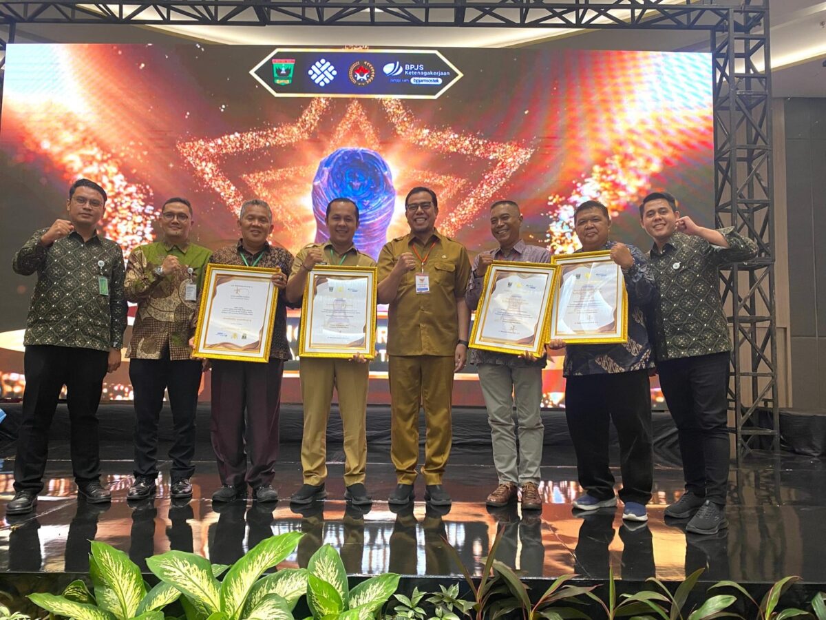 Keterangan Foto: Sekda Sijunjung Dr. Zefnihan, AP, M.Si didampinhi Kadisnakertrans Kabupaten Sijunjung Khamsiardi, SSTP, M.Si, PJ.Wali Nagari Koto Tuo dan Kepala Desa Kampung Baru usai menerima penghargaan Paritrana Award tingkat Provinsi Sumatera Barat tahun 2023, Senin (23/9) di Hotel Mercure Kota Padang. IST