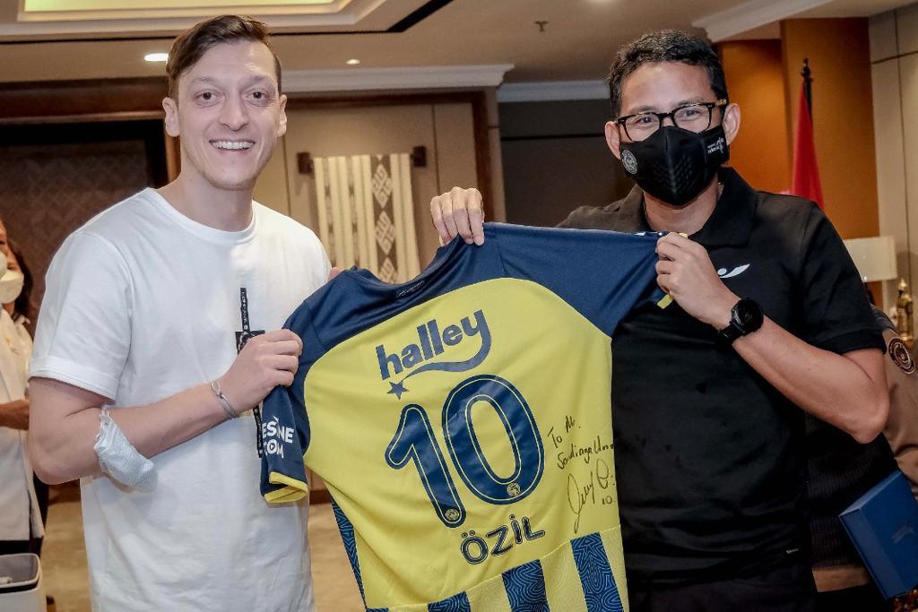 “Ini adalah bentuk dukungan kami bagi brand-brand Indonesia, produk Indonesia yang dikenal memiliki kualitas yang baik, produk berkualitas dunia sehingga dapat mendukung sport tourism dalam menghadirkan peluang kerja yang berkualitas untuk Indonesia dan dunia,” kata Menparekraf Sandiaga Uno saat jumpa pers bersama Mesut Ozil di Balairung Soesilo Soedarman, Gedung Sapta Pesona, Rabu (25/05/22).