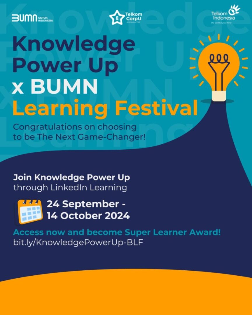 Saat ini, Telkom mengimplementasikan program “Knowledge Power Up” bagi karyawan dengan mengoptimalkan platform LinkedIn Learning. Hal ini sejalan dengan partisipasi perusahaan dalam rangkaian kegiatan BUMN Learning Festival 2024 yang belum lama ini diluncurkan Kementerian Badan Usaha Milik Negara (BUMN) bersama dengan Forum Human Capital Indonesia (FHCI) dan BUMN School of Excellence (BSE). Telkom turut serta dalam serangkaian kegiatan gelaran tersebut, mulai dari self learning initiative, learning roadshow, dan learning festival race.
