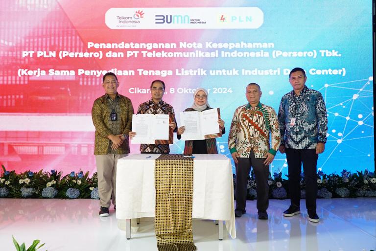 (Kiri ke Kanan) Direktur Wholesale and International Service Telkom Bogi Witjaksono, Direktur Group Business Development Telkom Honesti Basyir, Direktur Retail dan Niaga PLN Edi Srimulyanti, ? ?EVP Penjualan dan Pelayanan Pelanggan Enterprise PLN Nayusrizal, dan CEO NeutraDC Andreuw Th.A.F pada acara penandatanganan nota kesepahaman antara PT Telkom Indonesia (Persero) dan PT PLN (Persero) untuk Kerja Sama Penyediaan Tenaga Listrik untuk Industri Data Center yang berlangsung pada Selasa, (8/10). IST