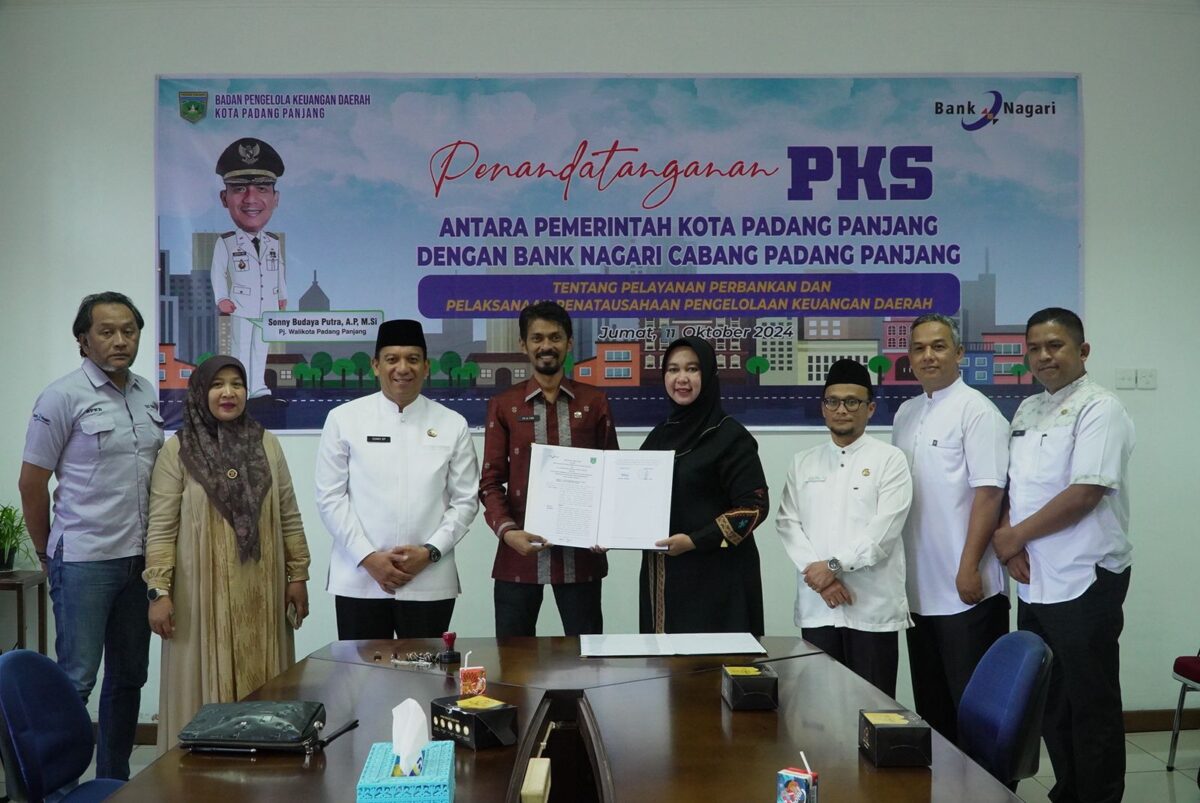 PADANG PANJANG, HARIANHALUAN.ID — Dalam upaya meningkatkan kualitas pelayanan publik dan pengelolaan keuangan daerah, Pemerintah Kota Padang Panjang melalui Badan Pengelola Keuangan Daerah (BPKD) resmi menjalin kerjasama dengan Bank Nagari. Penandatanganan Perjanjian Kerjasama (PKS) dilakukan oleh Plh. Kepala BPKD Zia Ul Fikri dan Pimpinan Cabang Bank Nagari Padang Panjang Imelda Angreini di ruang rapat BPKD, Jumat (11/10).