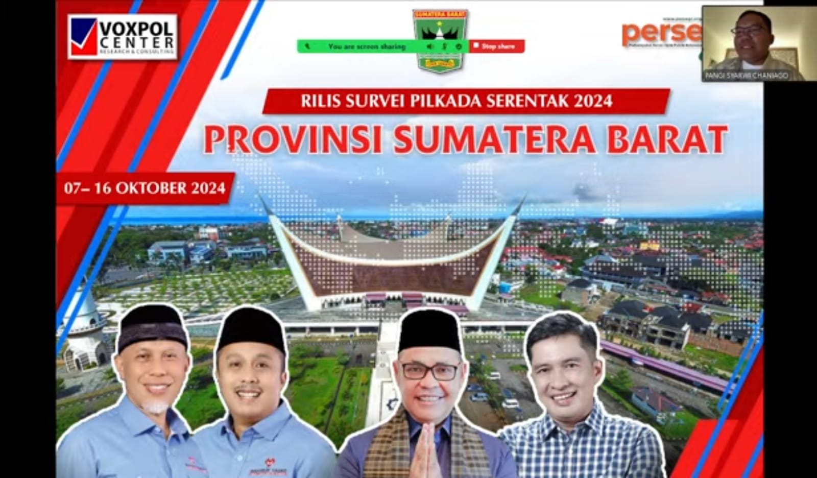 PADANG,HARIANHALUAN.ID- Lembaga survei Voxpol Center Research and Consulting merilis hasil survei elektabilitas terbaru pasangan kandidat Calon Gubernur dan Wakil Gubernur yang akan berlaga pada Pemilihan Gubernur (Pilgub) Sumbar tanggal 27 November 2024 mendatang.