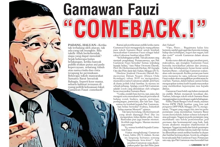 Gamawan Fauzi comeback! Tulis Headline berita Koran Haluan edisi Senin, 30 Mei 2022. Berita ini pun langsung ramai jadi pembicaraan publik. Tak hanya di warung kopi, para perantau di Jakarta, tokoh masyarakat hingga akademisi pun merespon sosok Gamawan. “Tak terhalang aturan, tak ada yang tak mungkin, beliau sosok yang dirindukan,” ujar mereka.