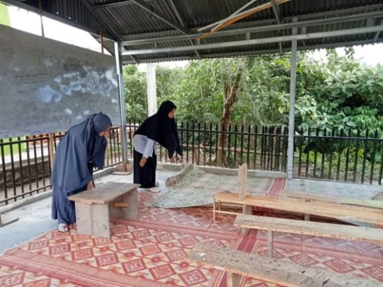 Santri di Pondok Pesantren Nurul Yaqin Ambung Kapur pada saat membersihkan salah satu ruang belajar terbuka, Rabu (1/12). SUCI WAHYUNI