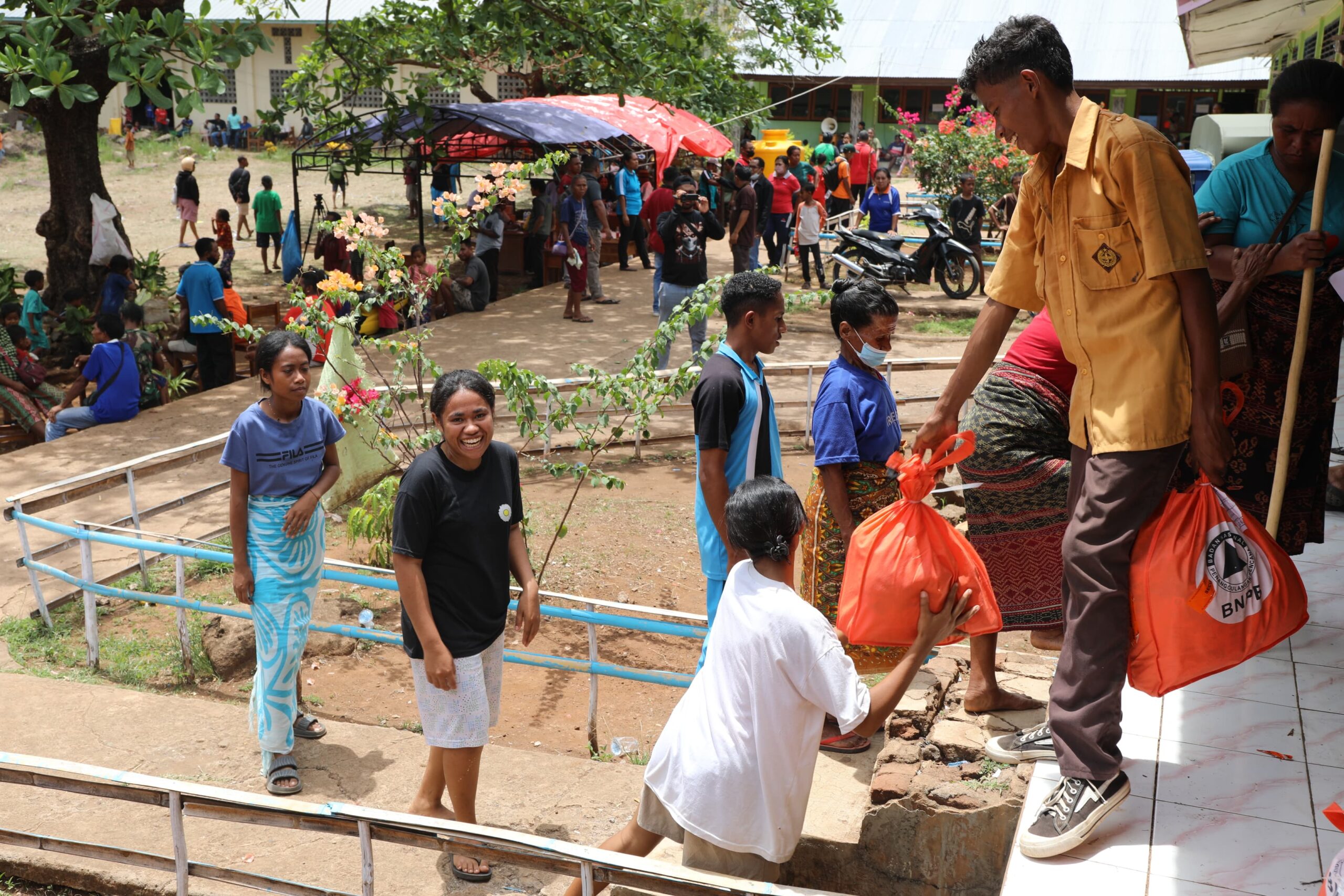 Dukungan bantuan dari berbagai lapisan masyarakat juga sudah berdatangan, dari mulai bantuan logistik, pelayanan kesehatan hingga dukungan psikososial dari guru-guru di Kabupaten Flores Timur ini. Adapun dukungan pelayanan kesehatan terlihat dengan tersedianya tenaga Kesehatan yang langsung memberikan pengobatan bagi pengungsi dan dukungan psikosial yang diberikan melalui kegiatan bernyanyi, bercanda dan aktivitas dengan para pengungsi khususnya anak-anak.
