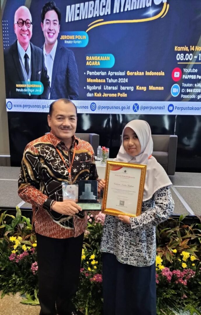 Teks foto : Carrisa Mutia Rahimi bersama Kepala MTsN 6 Padang Yakub usai menerima penghargaan.