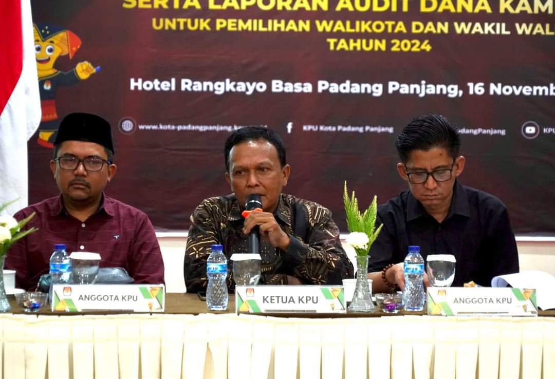 Hal ini mengemuka pada Rapat Koordinasi Penyampaian LPPDK serta Laporan Audit Dana Kampanye, Sabtu (16/11/2024), di Hotel Rangkayo Basa. Rapat ini dihadiri perwakilan paslon dan undangan lainnya.