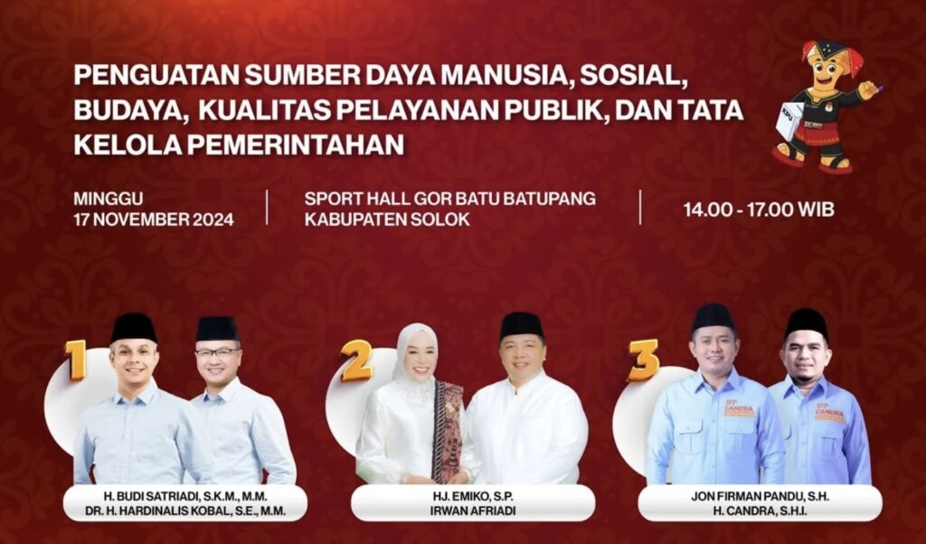SOLOK, HARIANHALUAN.ID—Debat pasangan calon (Paslon) yang diadakan oleh Komisi Pemilihan Umum (KPU) Kabupaten Solok bertujuan agar visi misi kandidat dapat diketahui oleh masyarakat. Dalam debat kedua yang diadakan di Hall GOR Batu Batupang, Kubung, Kabupaten Solok pada Minggu (17/11/2024) tampak Paslon nomor 2 Emiko-Irwan fokus menjelaskan program unggulan seperti untuk Gen Z Kreatif.
