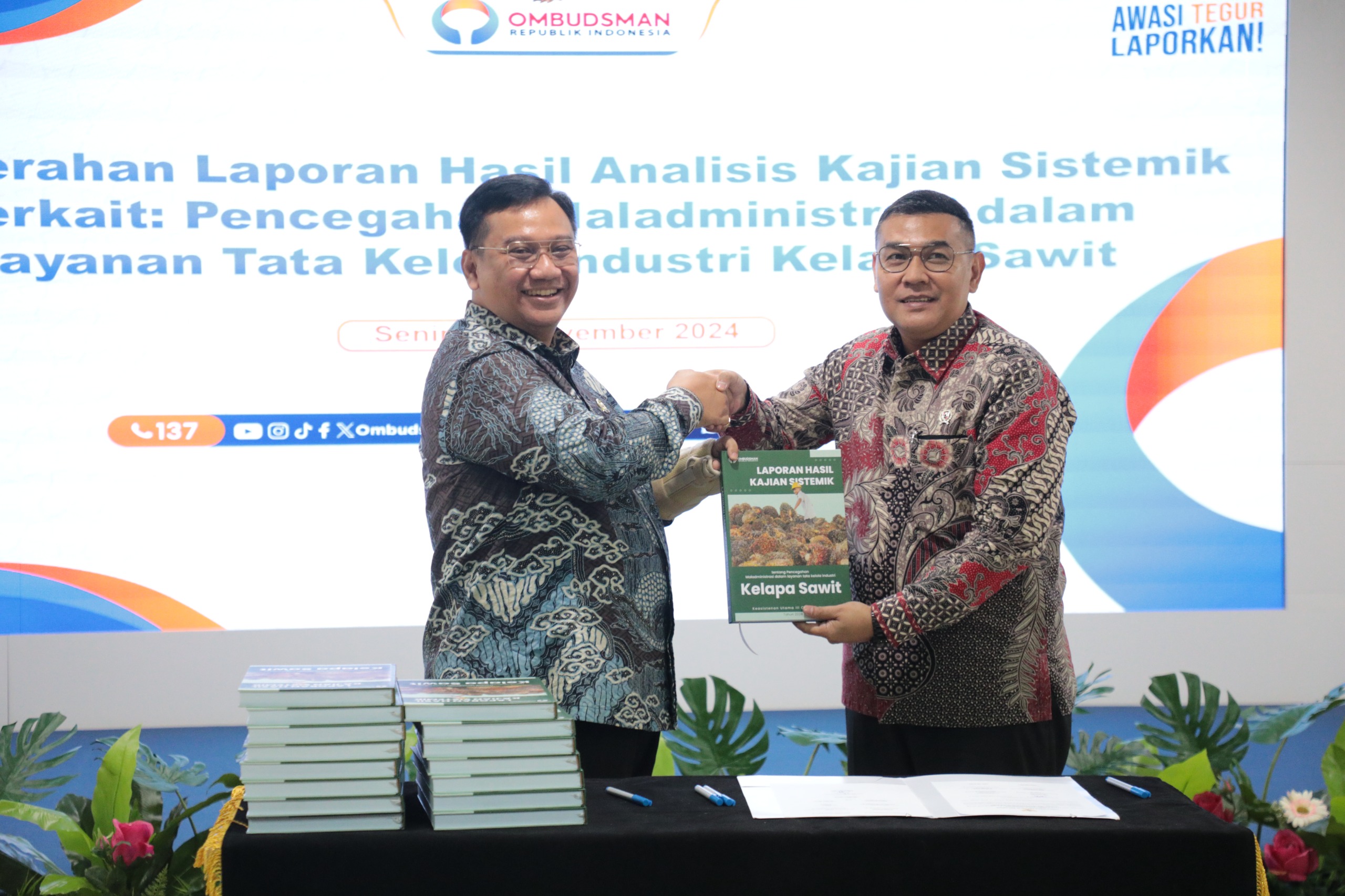 JAKARTA, HARIANHALUAN.ID – Menteri Agraria dan Tata Ruang/Kepala Badan Pertanahan Nasional (ATR/BPN) yang dalam hal ini diwakili Ossy Dermawan selaku Wakil Menteri (Wamen) ATR/Wakil Kepala (Waka) BPN menerima laporan hasil kajian sistemik tentang pencegahan maladministrasi dalam layanan tata kelola industri kelapa sawit dari Ombudsman Republik Indonesia (ORI), Senin (18/11/2024).