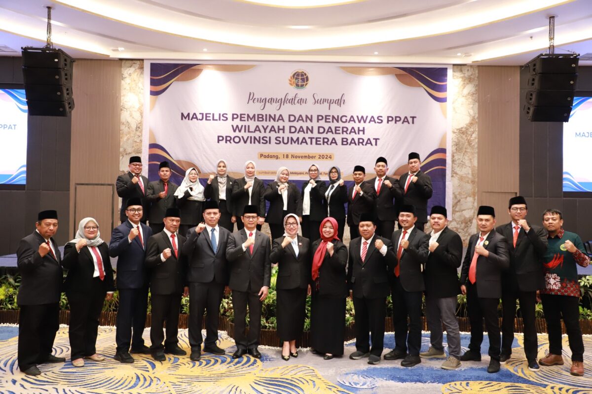 PADANG, HARIANHALUAN.ID – Sebanyak 24 pejabat Majelis Pembina dan Pengawas Pejabat Pembuat Akta Tanah (PPAT) Wilayah dan Daerah diangkat dan diambil sumpahnya oleh Kantor Wilayah BPN Sumatera Barat, yang terdiri dari satu pejabat di Kanwil BPN Sumbar, 14 pejabat di Kantor Pertanahan, serta sembilan unsur Ikatan PPAT.